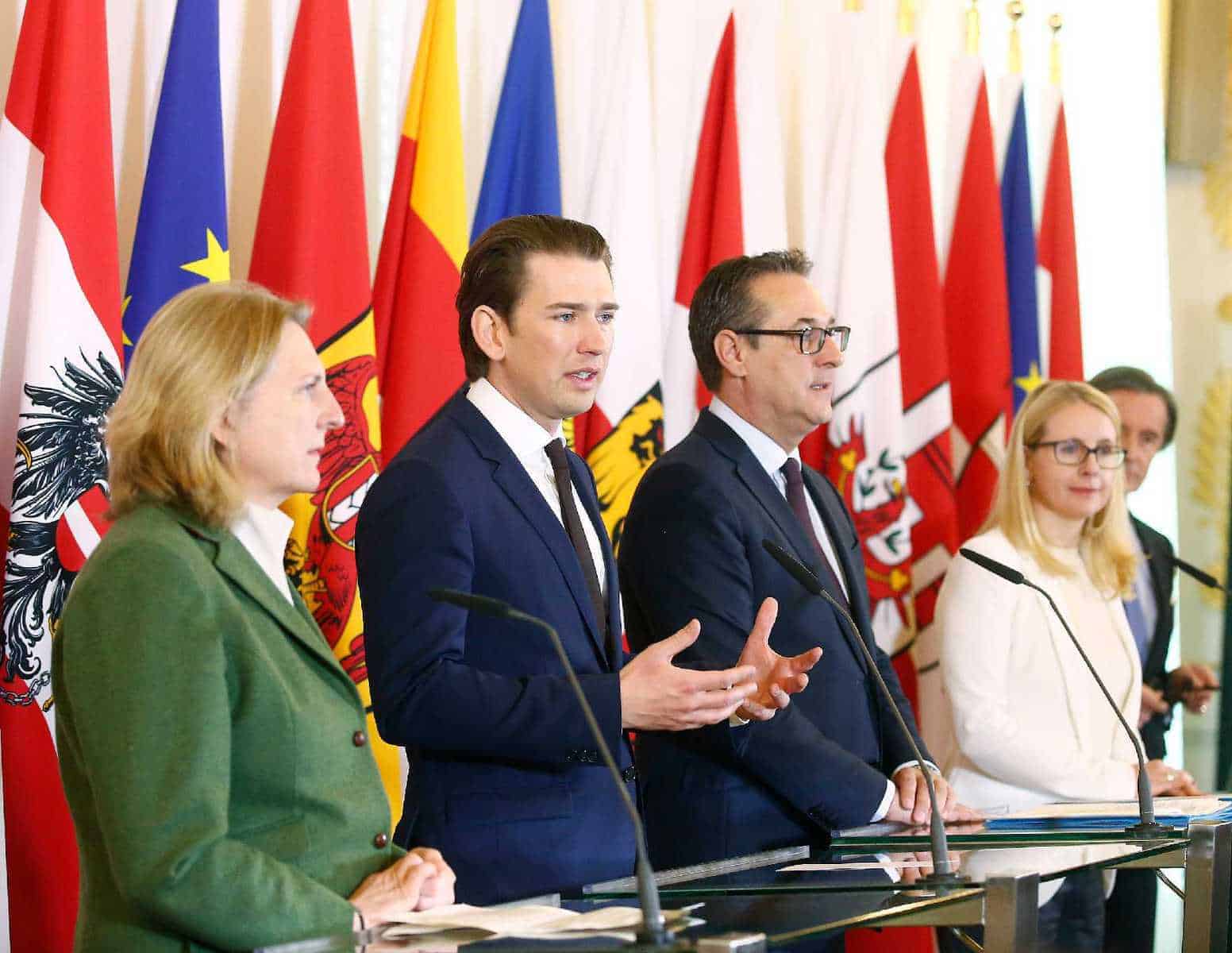 Bundeskanzler Sebastian Kurz (2.v.l.), Vizekanzler Heinz-Christian Strache (m.), Bundesministerin Karin Kneissl (l.), Bundesministerin Margarete Schramböck (2.v.r.) und Regierungssprecher Peter Launsky-Tieffenthal (r.) beim Pressefoyer nach dem Ministerrat am 4. April 2018. © BKA/Dragan Tatic