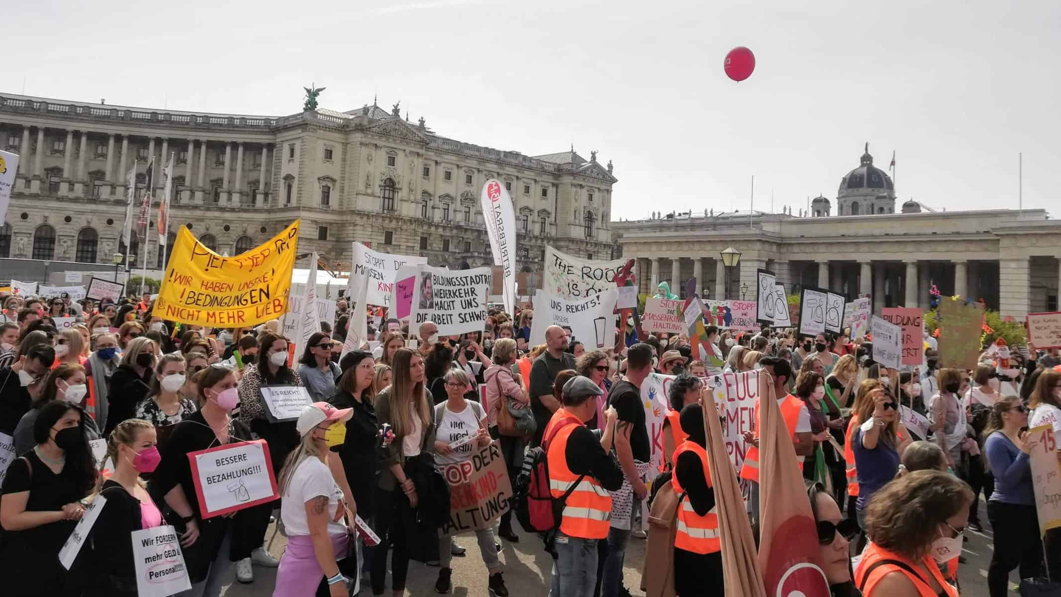 Der Unmut bei den Demonstrant*innen war groß. Bereits im Oktober hat eine öffentliche Betriebsversammlung stattgefunden. Damals haben sich etwa 5.000 Angestellte im Votivpark versammelt. Die Lage hat sich seither nicht gebessert. Das machen auch die Plakate der Teilnehmer*innen deutlich. „Wir können nicht mehr“, „Ich kann gar nicht so schlecht arbeiten, wie ich bezahlt werde“, steht darauf in bunter Schrift.
