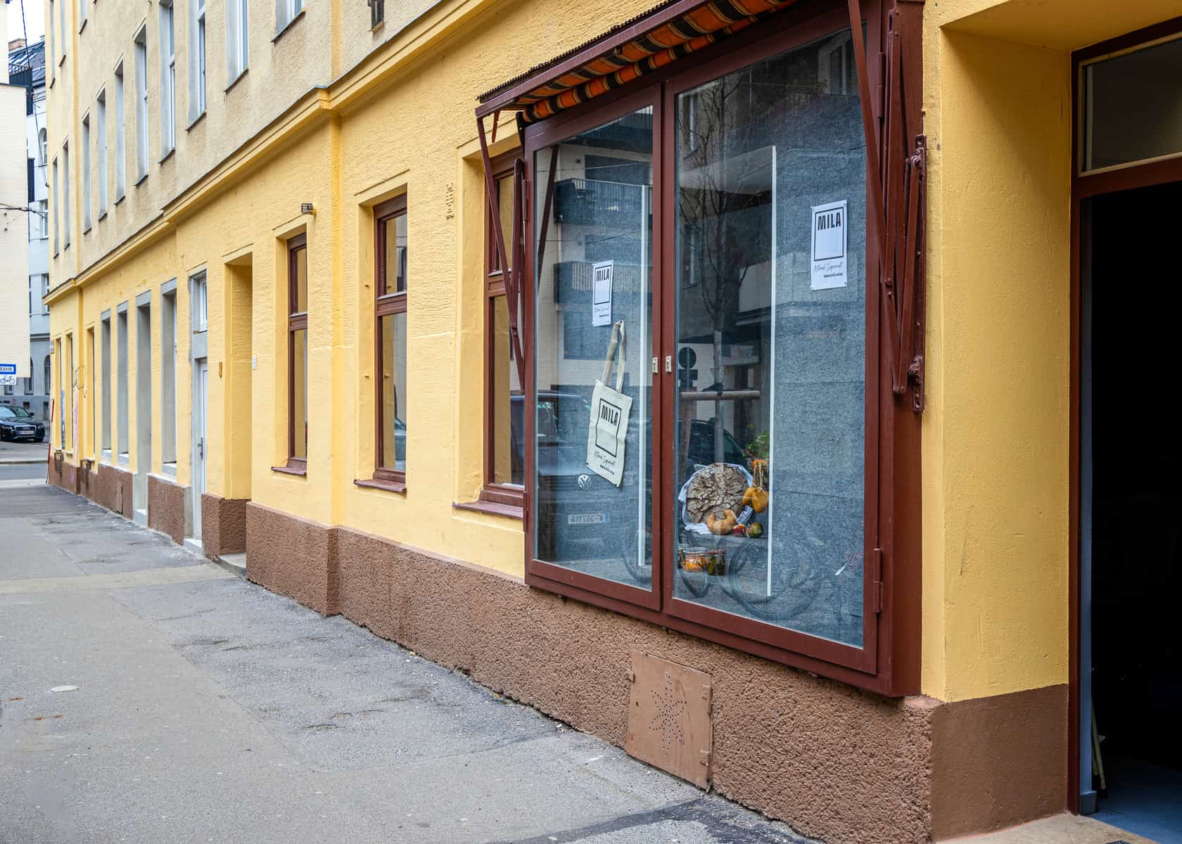 Schaufenster des MILA Mitmach-Supermarkt, Gehsteig und gelber Hausfassade Außenansicht des MILA-Minimarkts in der Haberlgasse 58, Ottakring, Wien